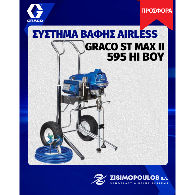 Το μηχάνημα βαφής airless Graco ST Max II 595 PC Pro Hi Boy, είναι η ιδανική επιλογή για τον επαγγελματία που χρειάζεται την υψηλότερη δυνατή απόδοση από μια μικρή, φορητή μονάδα. Υποστηρίζει τις συμβουλές ψεκασμού WideRAC  για την ταχύτερη ολοκλήρωση έργων μεγάλης επιφάνειας.