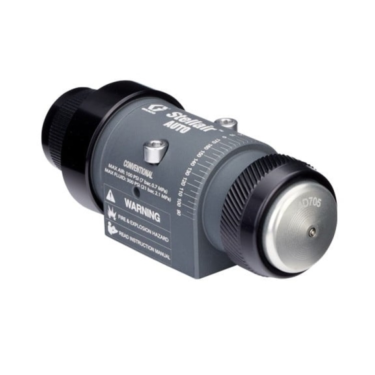 '- Το συμβατικό πιστόλι ψεκασμού αέρα παράγει άψογο φινίρισμα σε μια αυτοματοποιημένη γραμμή βαφής ή σε ένα ρομποτικό θάλαμο ψεκασμού.