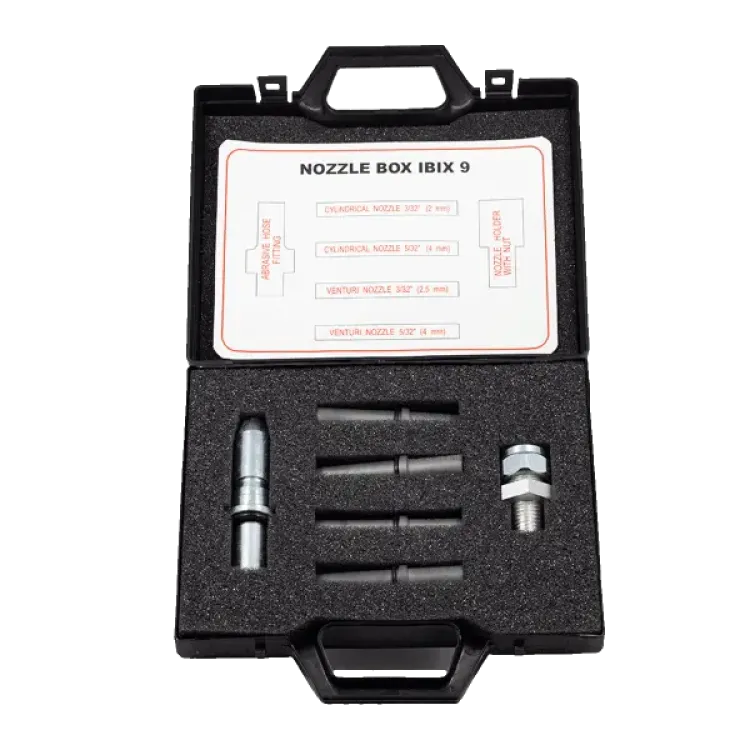 Η θήκη αποτελείται από κυλινδρικά, επιλεκτικά ακροφύσια που συγκεντρώνουν τη ροή του λειαντικού υλικού για έναν αποφασιστικό και ακριβή καθαρισμό, καθώς και από ακροφύσια Venturi, που ανοίγουν την επιφάνεια εργασίας, εξασφαλίζοντας έναν πιο ήπιο και ευαίσθητο χειρισμό. Τα ακροφύσια είναι κατασκευασμένα από καρβίδιο του βολφραμίου, ένα ανθεκτικό υλικό που εξασφαλίζει μακροχρόνια αντοχή και ισχυρή αντίσταση στην τριβή.