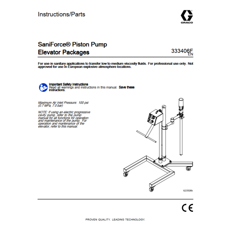 Still using hoists and chains to unload your drums or bins? Graco's SaniForce Elevator is ideal for small to medium size food and personal care companies who currently unload less than 2 containers per hour. Use with Graco's SaniForce 2:1, 5:1 or 6:1 Piston Pumps to transfer small batches of low to medium viscosity fluids.